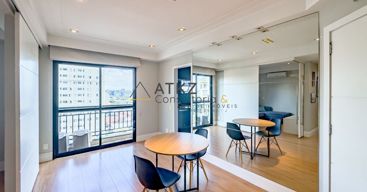 Apartamento para locação no Brooklin com 60m², 1 dormitório (suíte), 2 banheiros, varanda, 1 vaga de garagem e totalmente mobiliado.
